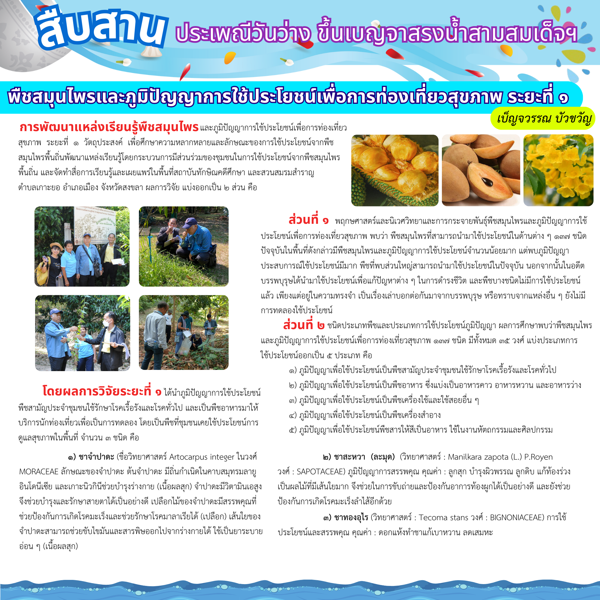 • โครงการพัฒนาแหล่งเรียนรู้พืชสมุนไพรและภูมิปัญญาการนำไปใช้ประโยชน์เพื่อการท่องเที่ยวสุขภาพระยะที่ 1 (หนังสือบุดและพืชในสถาบันทักษิณคดีศึกษา) - นางสาวเบ็ญจวรรณ บัวขวัญ
