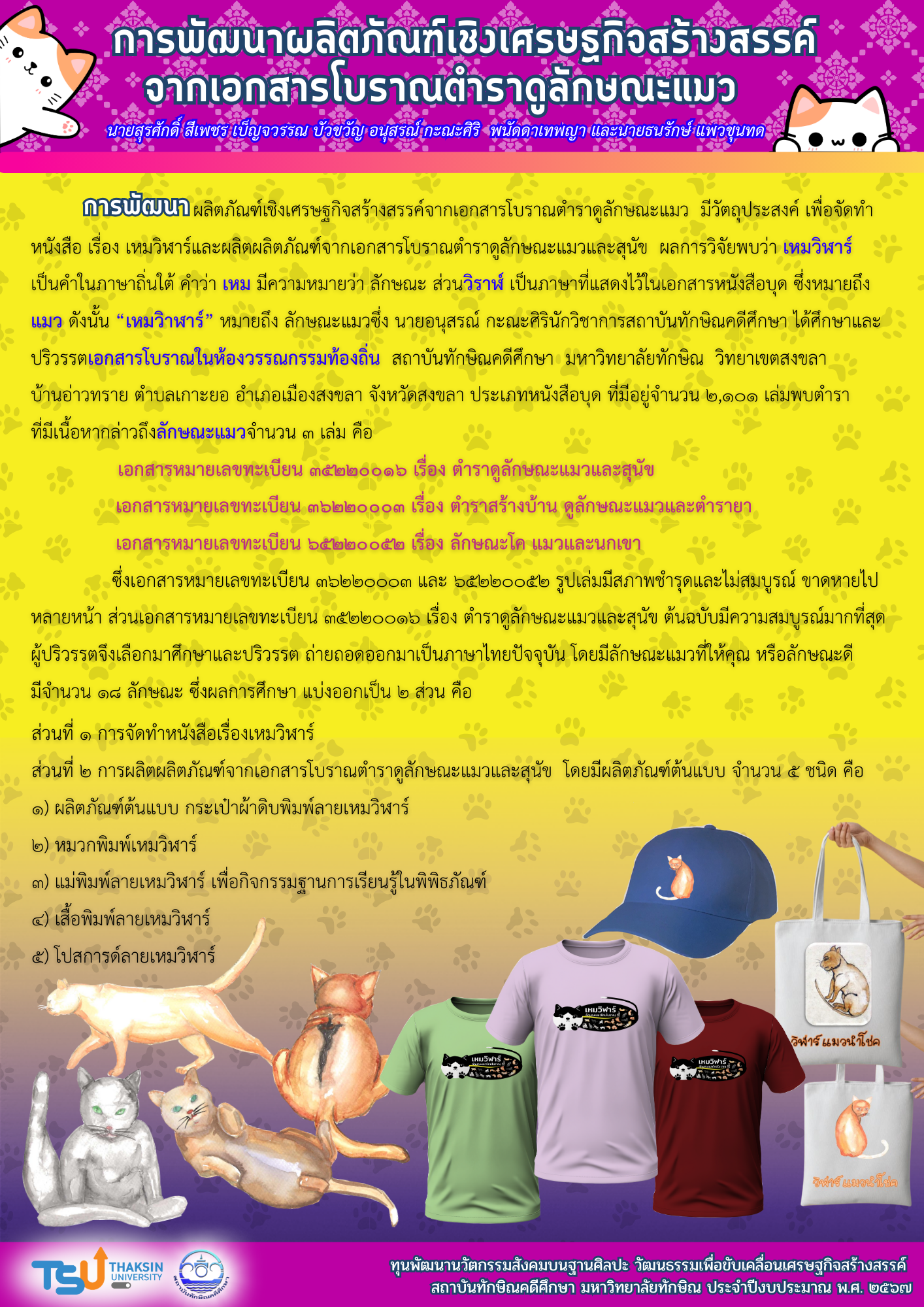 • โครงการพัฒนาผลิตภัณฑ์เชิงเศรษฐกิจสร้างสรรค์จากเอกสารโบราณตำราดูลักษณะแมว - นางพนัดดา เทพญา
