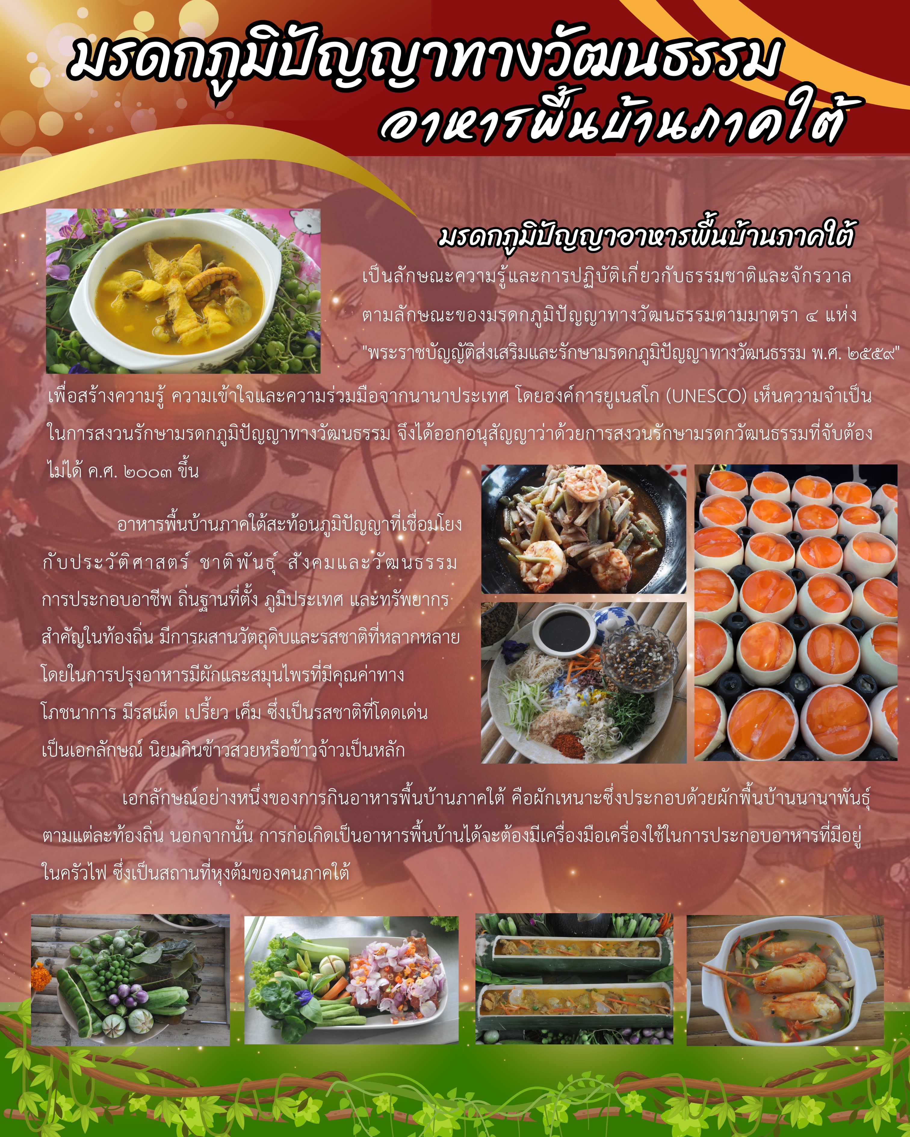 • มรดกภูมิปัญญาทางวัฒนธรรมอาหารพื้นบ้านภาคใต้ (ครัวไฟปักษ์ใต้) - นางสาวเบ็ญจวรรณ บัวขวัญ
